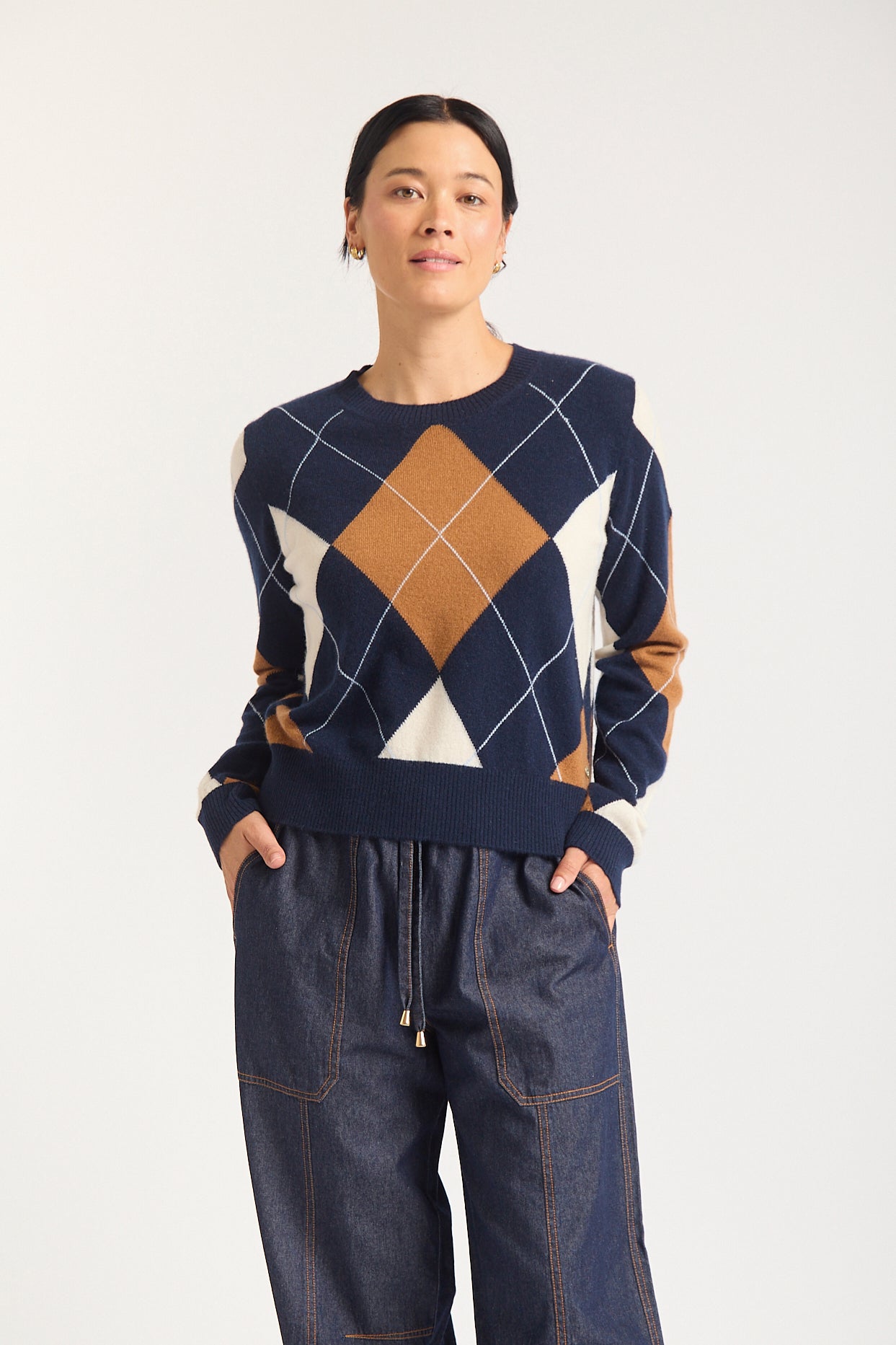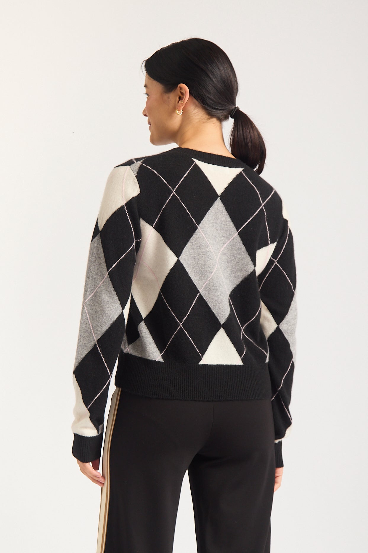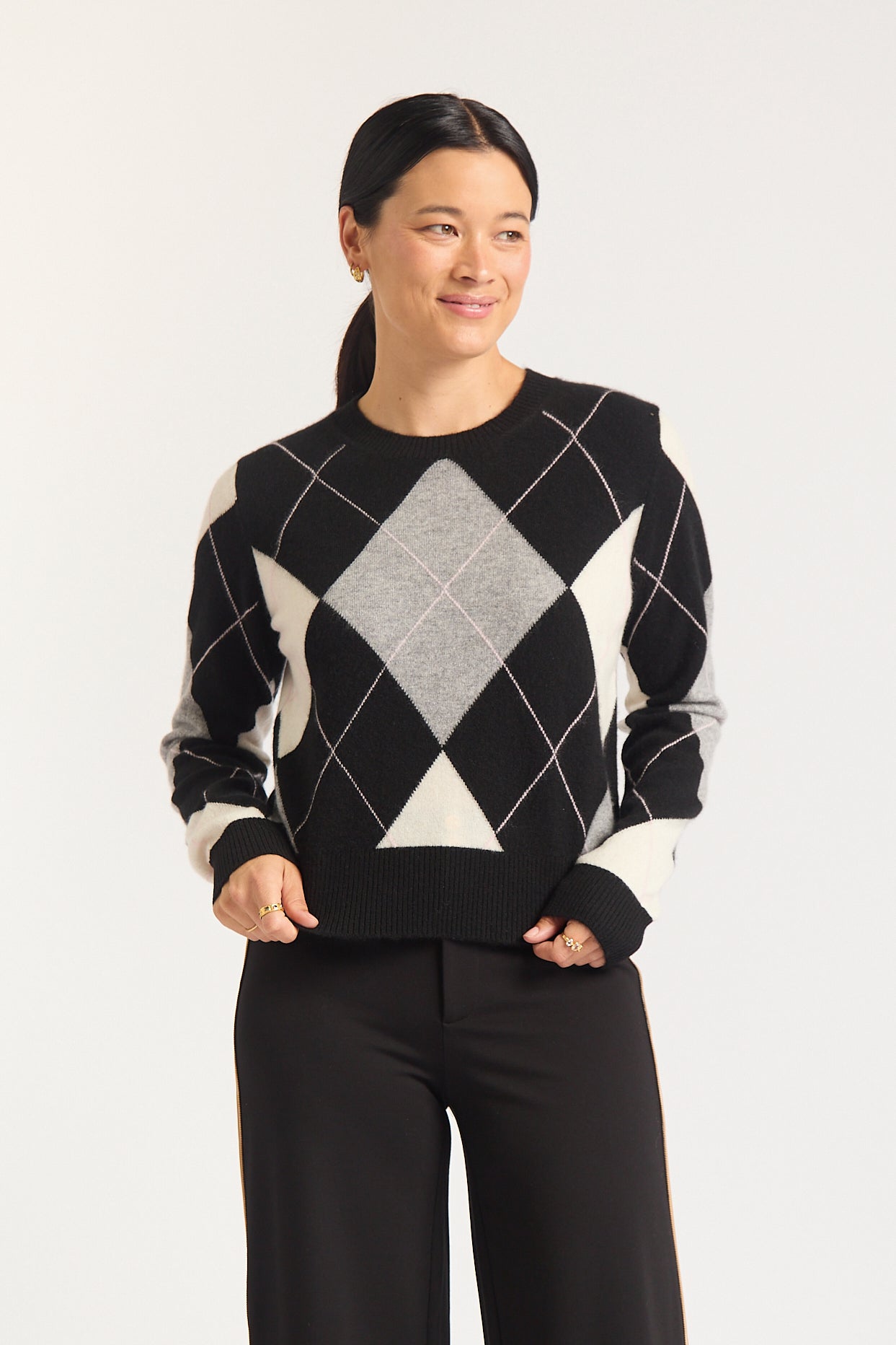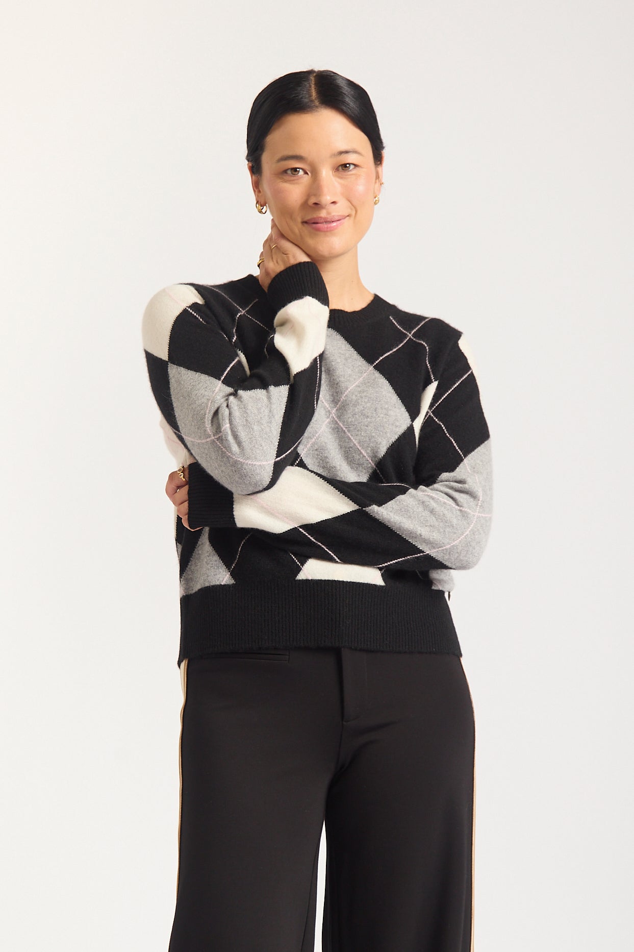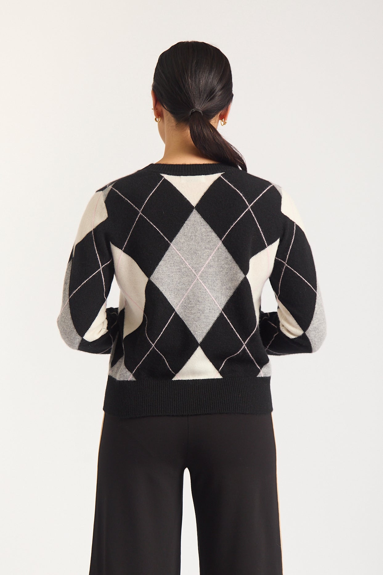Elevate your wardrobe with the Henriette Cashmere Sweater, a luxurious blend of comfort and style. Featuring a classic argyle pattern in sophisticated shades of black, grey, and soft pink, this sweater is perfect for any occasion.