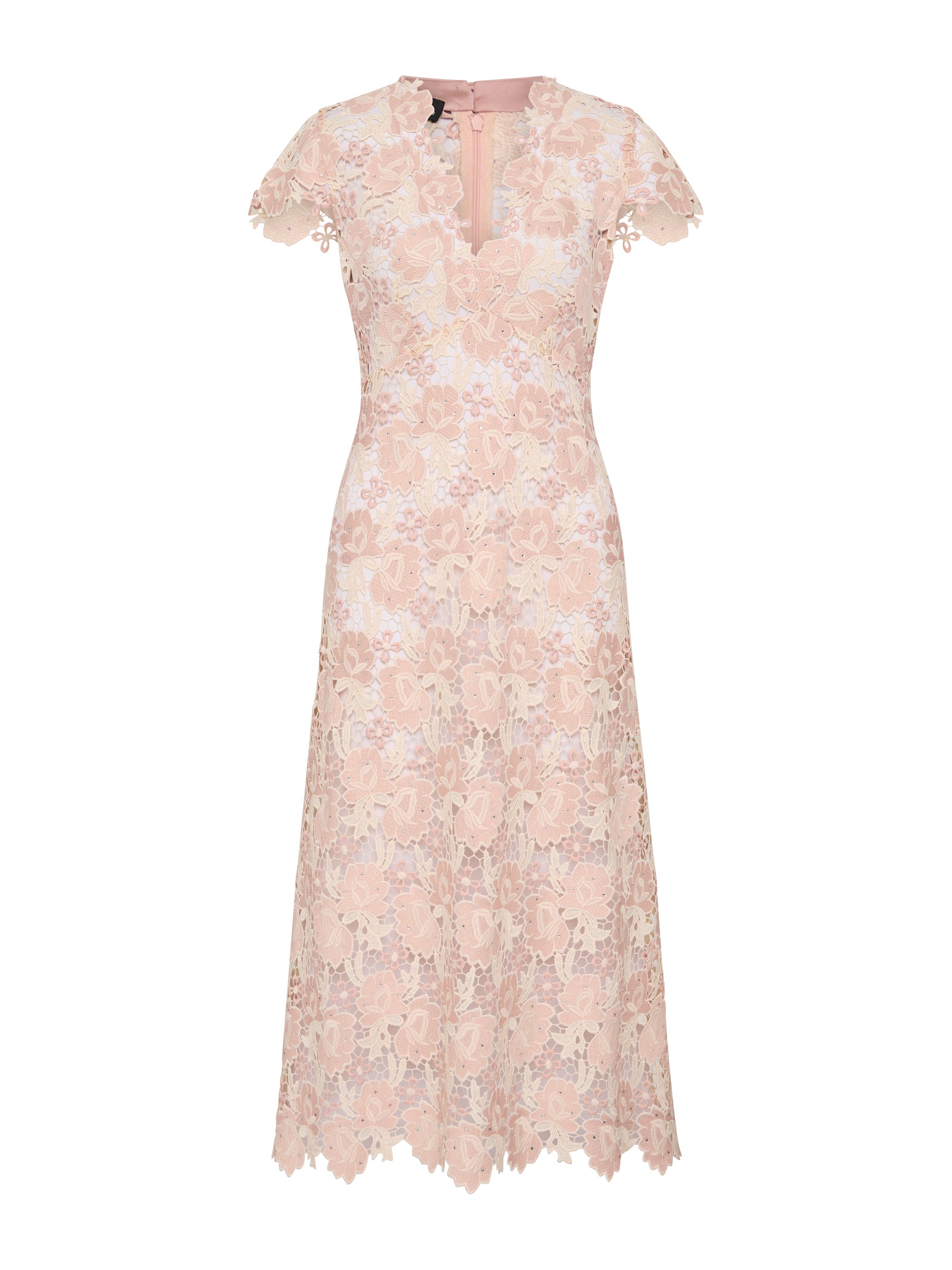 The Belinda Dress is an elegant midi dress crafted from intricate guipure lace with a two-tone dusty pink and cream colouring and delicate diamante detailing. Featuring a flattering V-neckline, scalloped cap sleeves and soft A-line skirt, it’s ideal for weddings, formal luncheons and special daytime events.