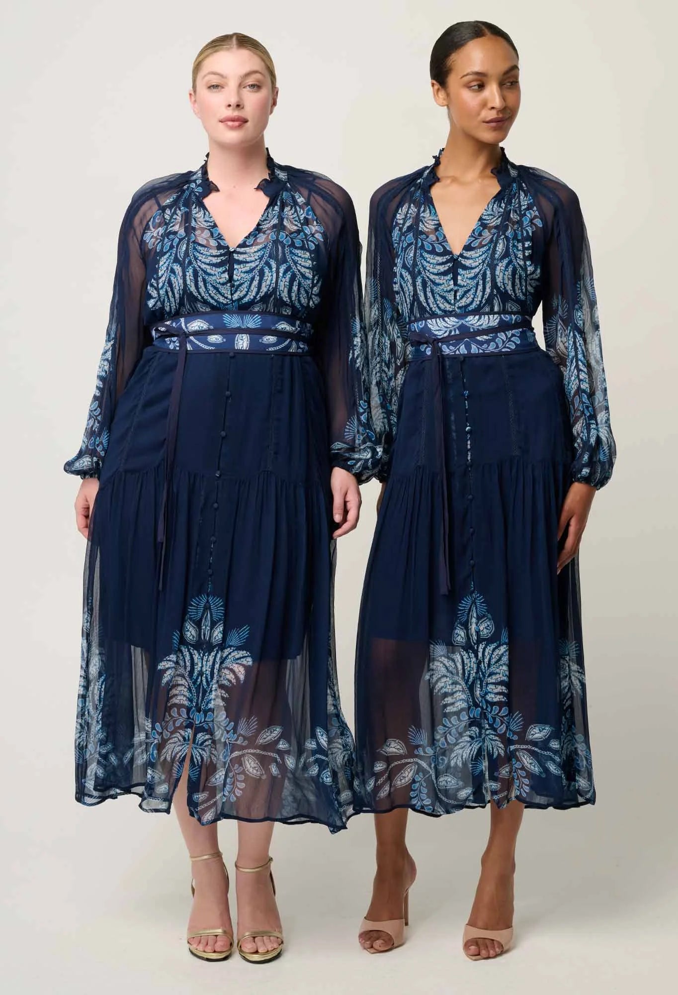 Featuring a striking Moonlit Batik placement print, the Sloane dress showcases intricate botanical motifs in deep navy and soft blue hues, thoughtfully positioned to flatter the silhouette. A softly gathered neckline flows into a delicate V-neck, while sheer long sleeves add an ethereal touch. The defined waist is accented with a coordinating tie belt, creating shape and balance before falling into a graceful midi-length skirt with subtle volume and button-through detailing.