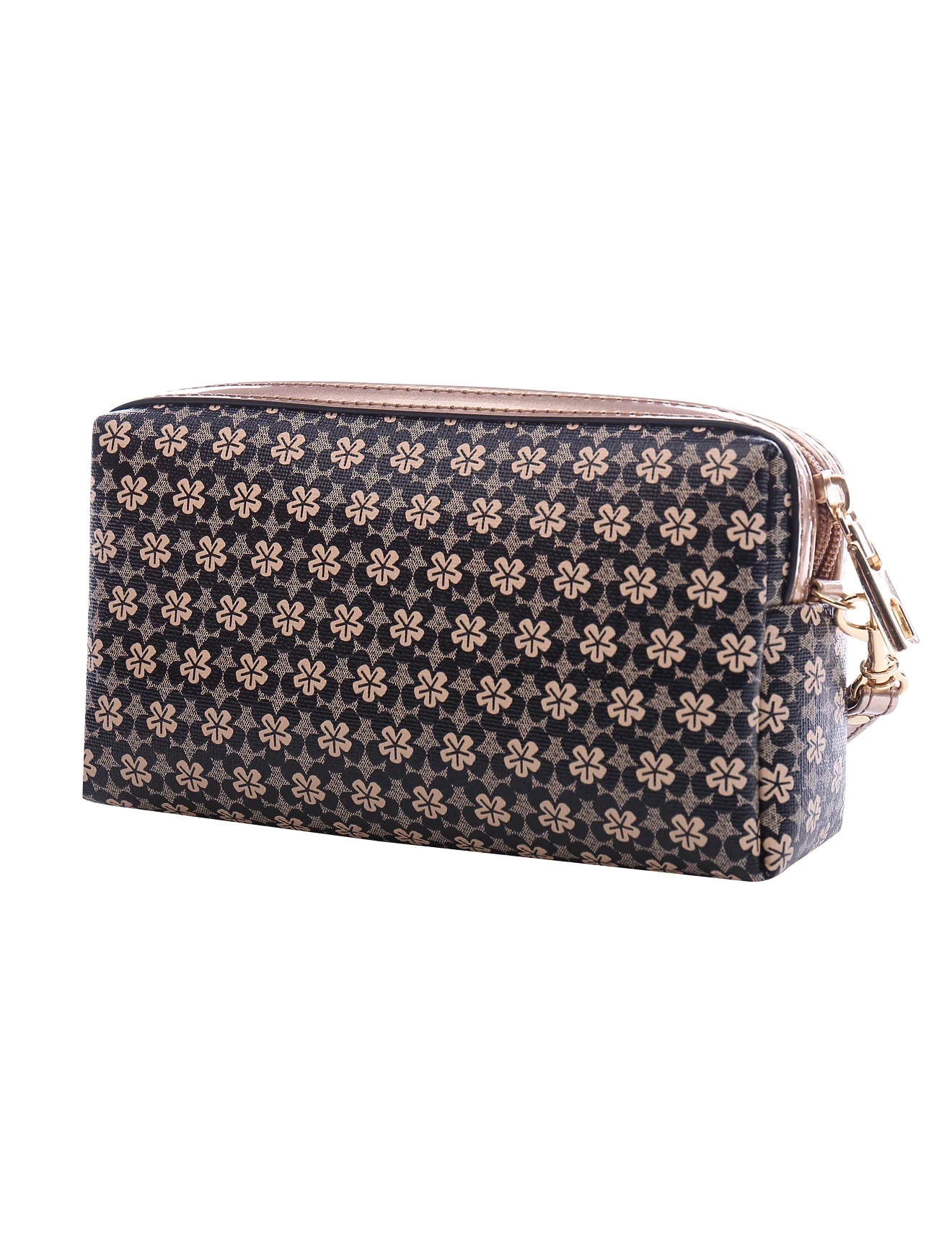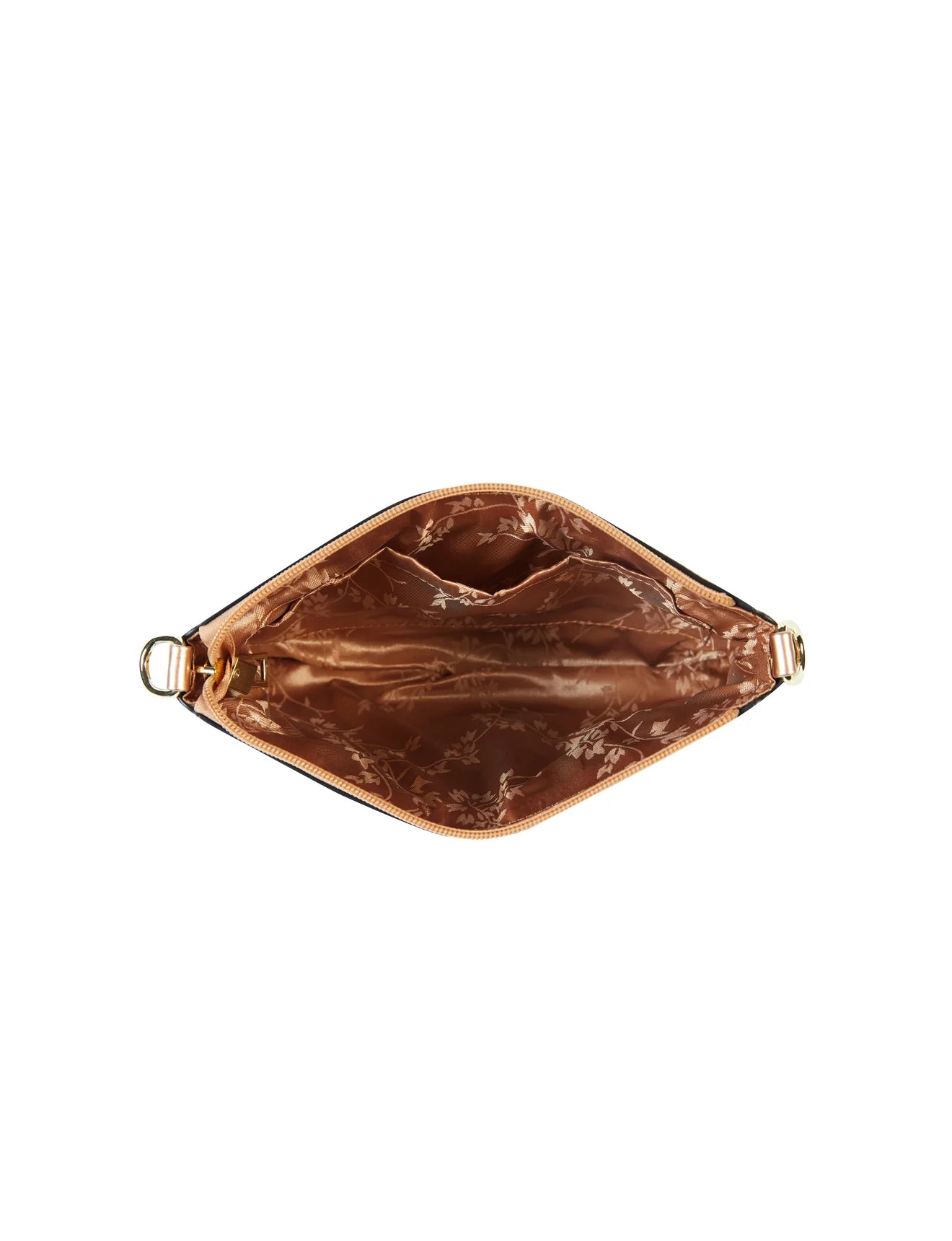 One generous zippered compartment with two internal zippered pockets and two interior slip pouches for business cards or mobile phone