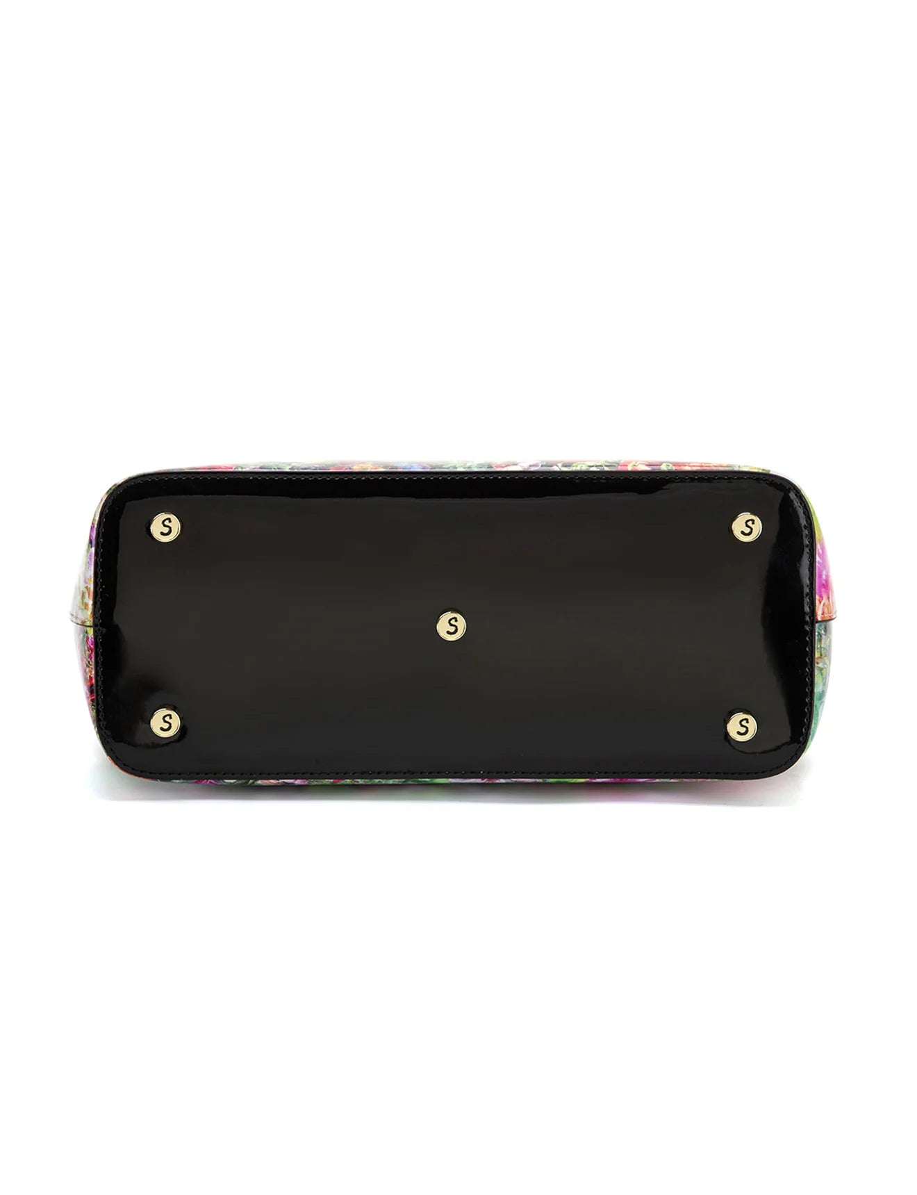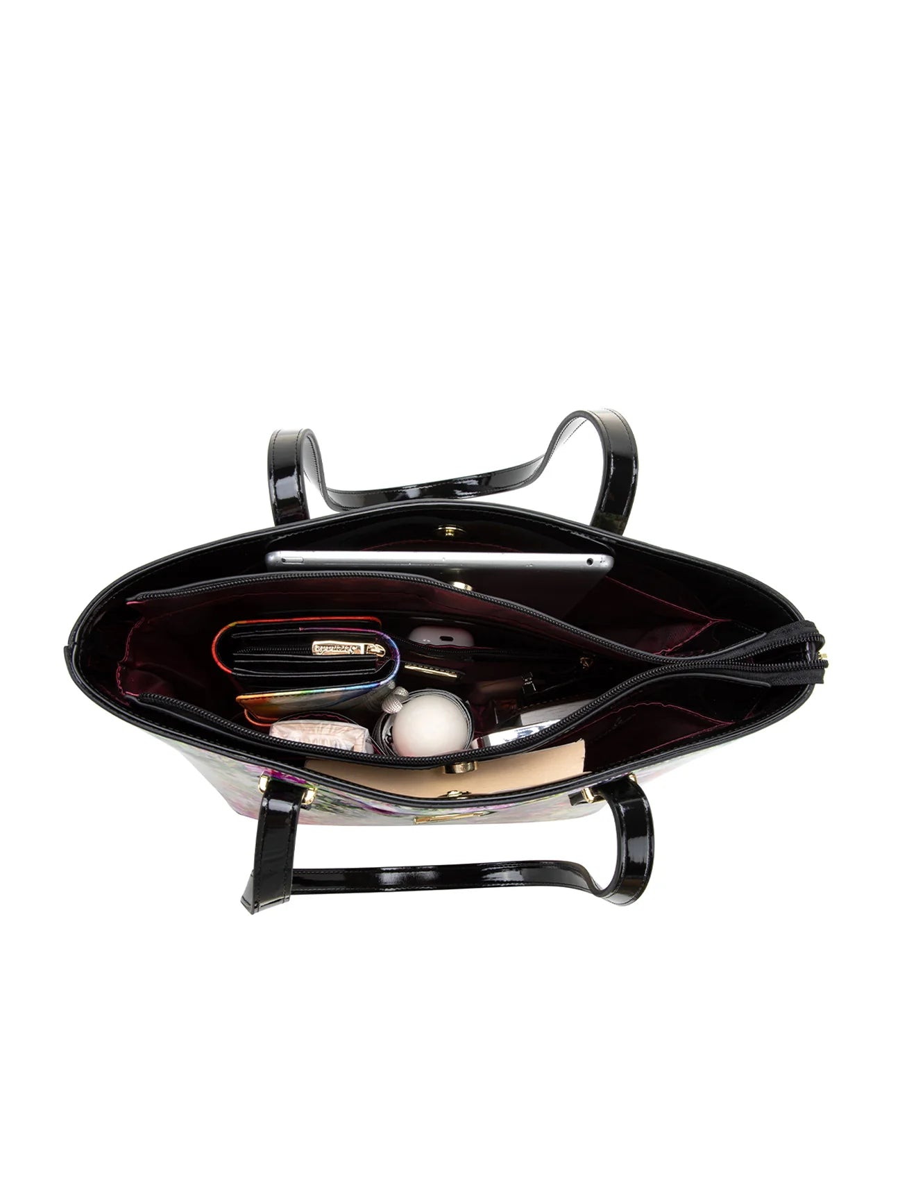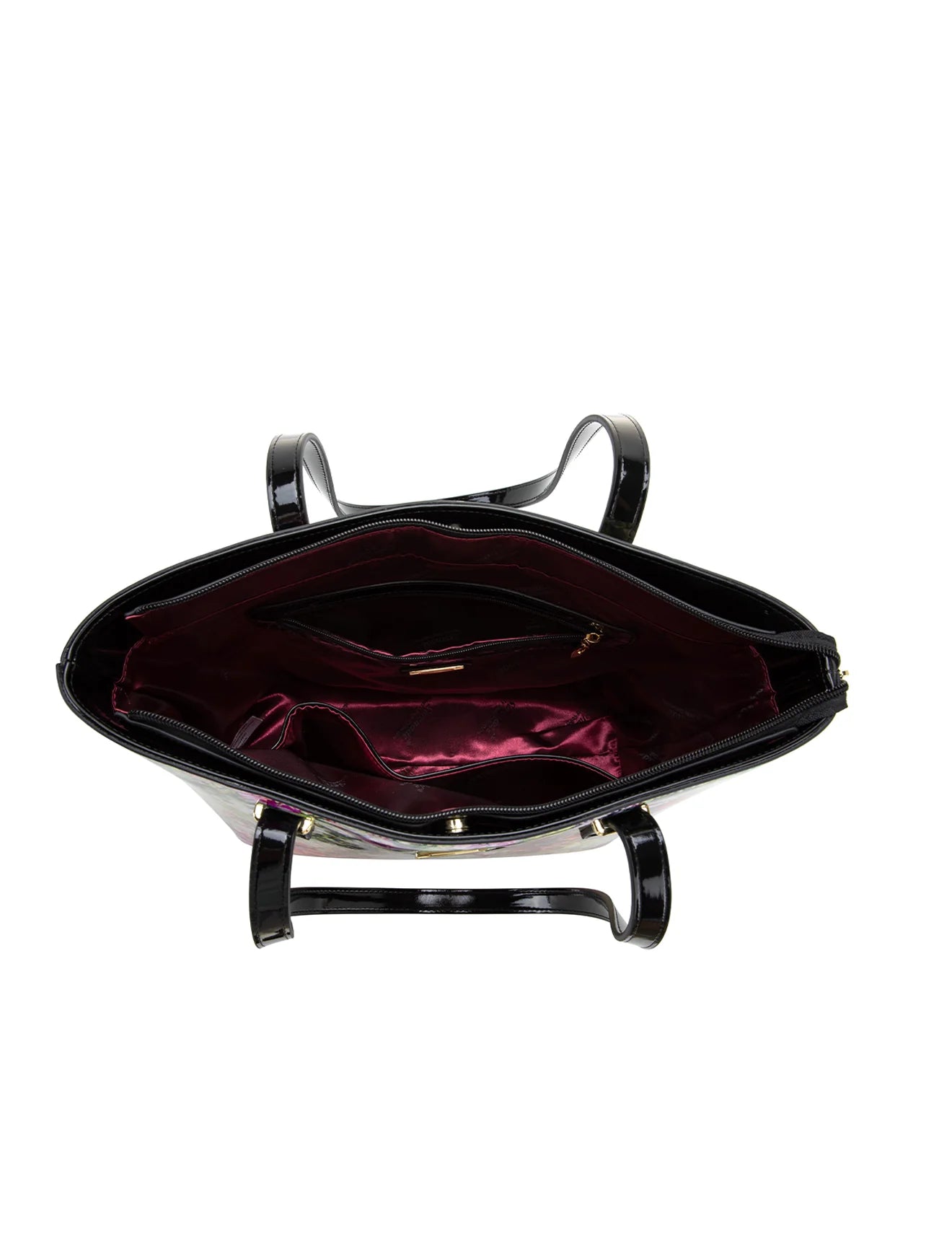 This Serenade Beverly Hills Collection, Fiore leather tote bag is perfect for everyday. Crafted from premium leather with a patent finish. This bag opens easily and features a central zippered compartment as well as two magnetic snap closure compartments.