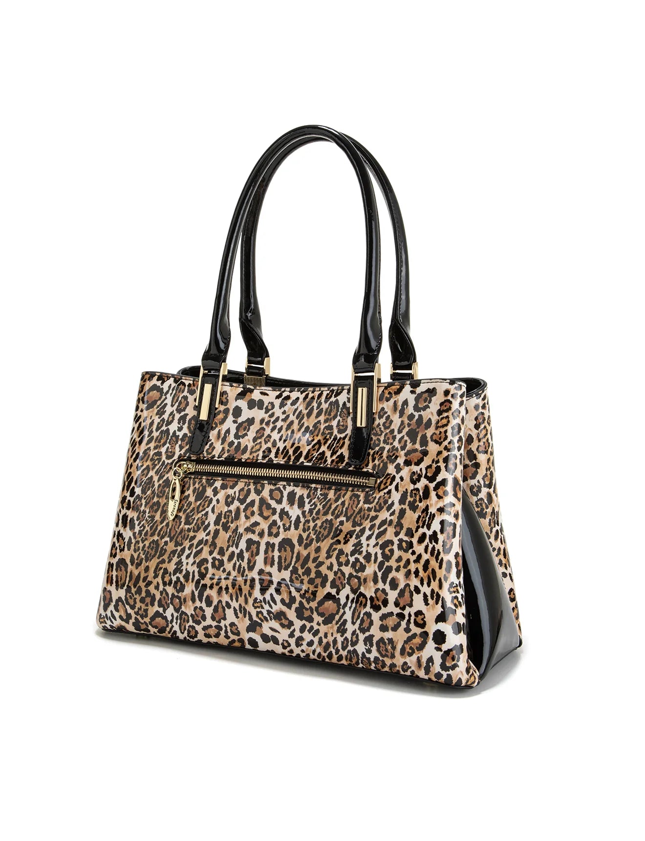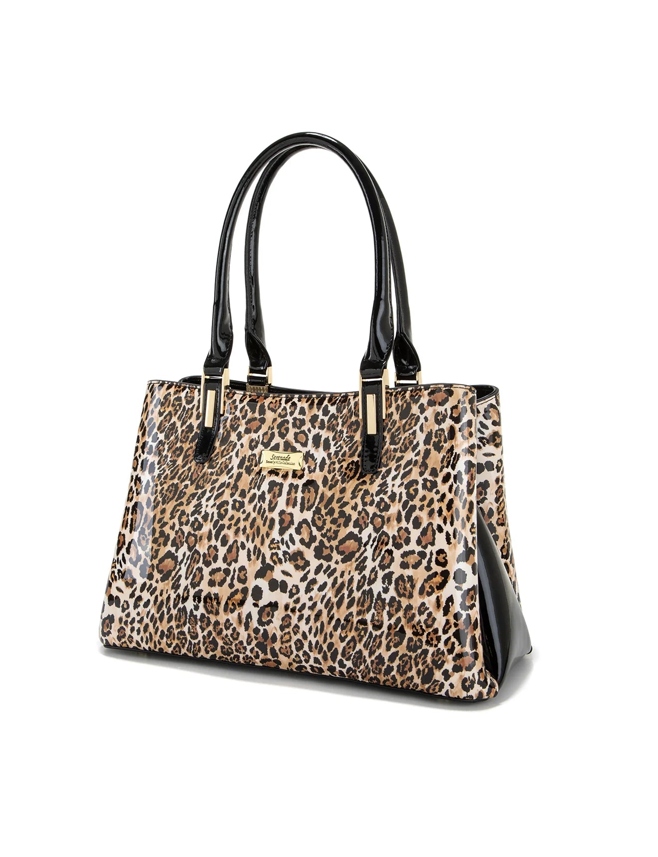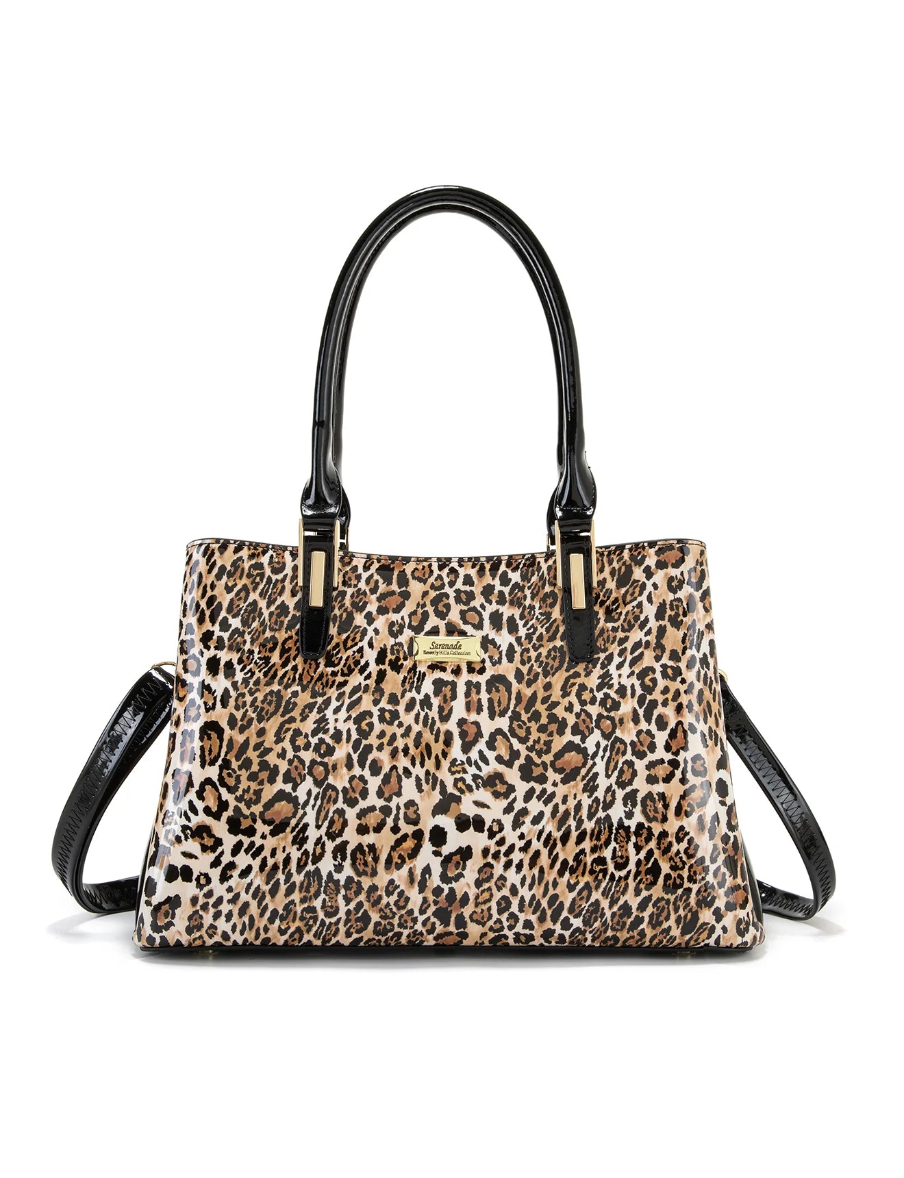 This Serenade Beverly Hills Collection, Wild Cat Grip top handbag is perfect for everyday. Crafted from premium patent leather with a stunning animal print which is complimented with Black patent leather handles and trim.