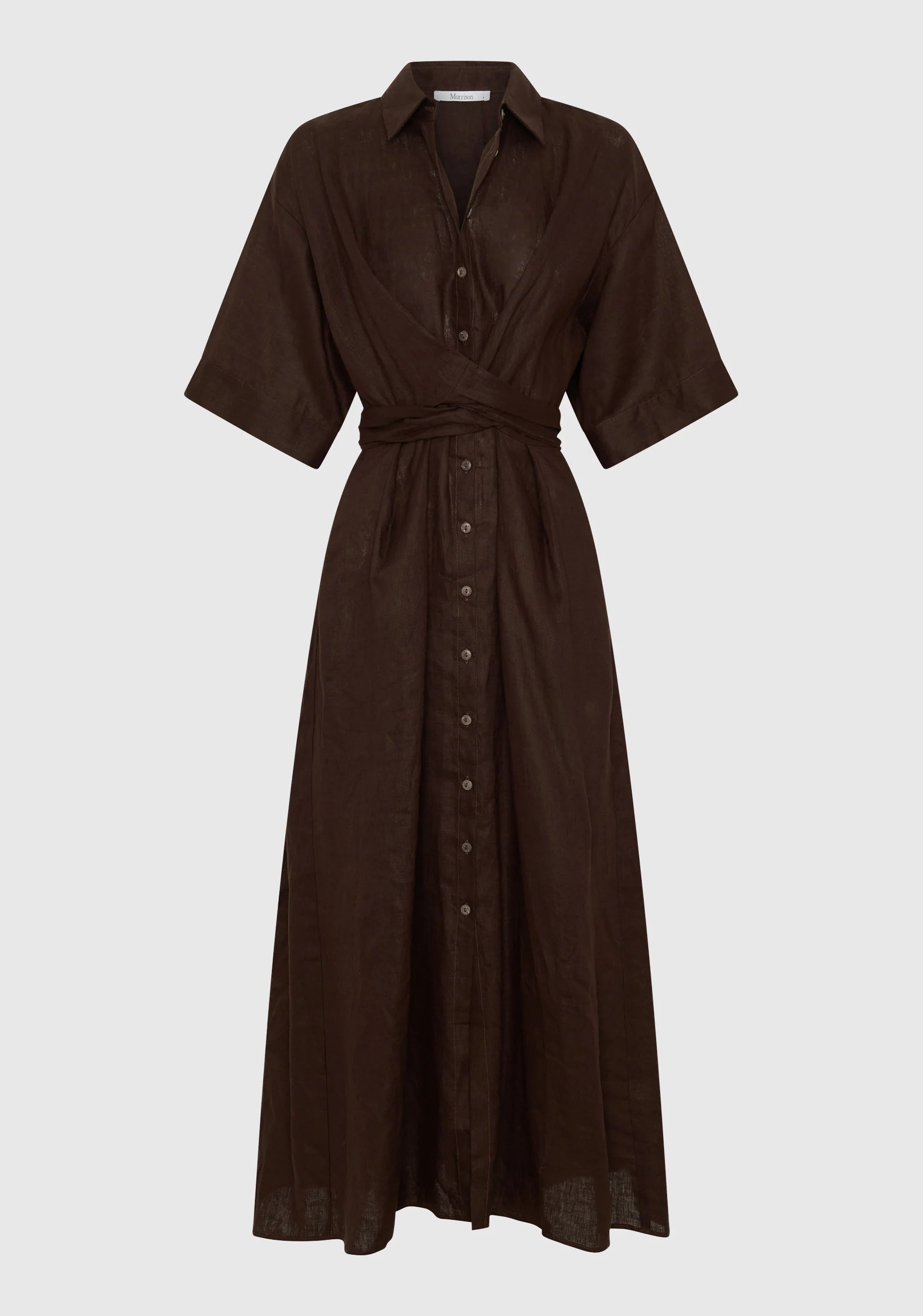The Harriet Linen Dress blends structure and ease in premium linen. Featuring a traditional collar, wrap-around waist tie, and swing skirt silhouette, it offers a flattering fit with a timeless edge. Elbow length sleeves, midi hemline, and side pockets complete this refined wardrobe essential.