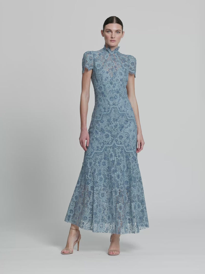 The Lauren Midi Dress offers refined elegance in corded two-tone blue velvet lace. Designed with a soft high neckline and cap sleeves, fitted through the body and falling to a flattering mid-calf length A-line skirt, making it an ideal choice for elevated evenings.