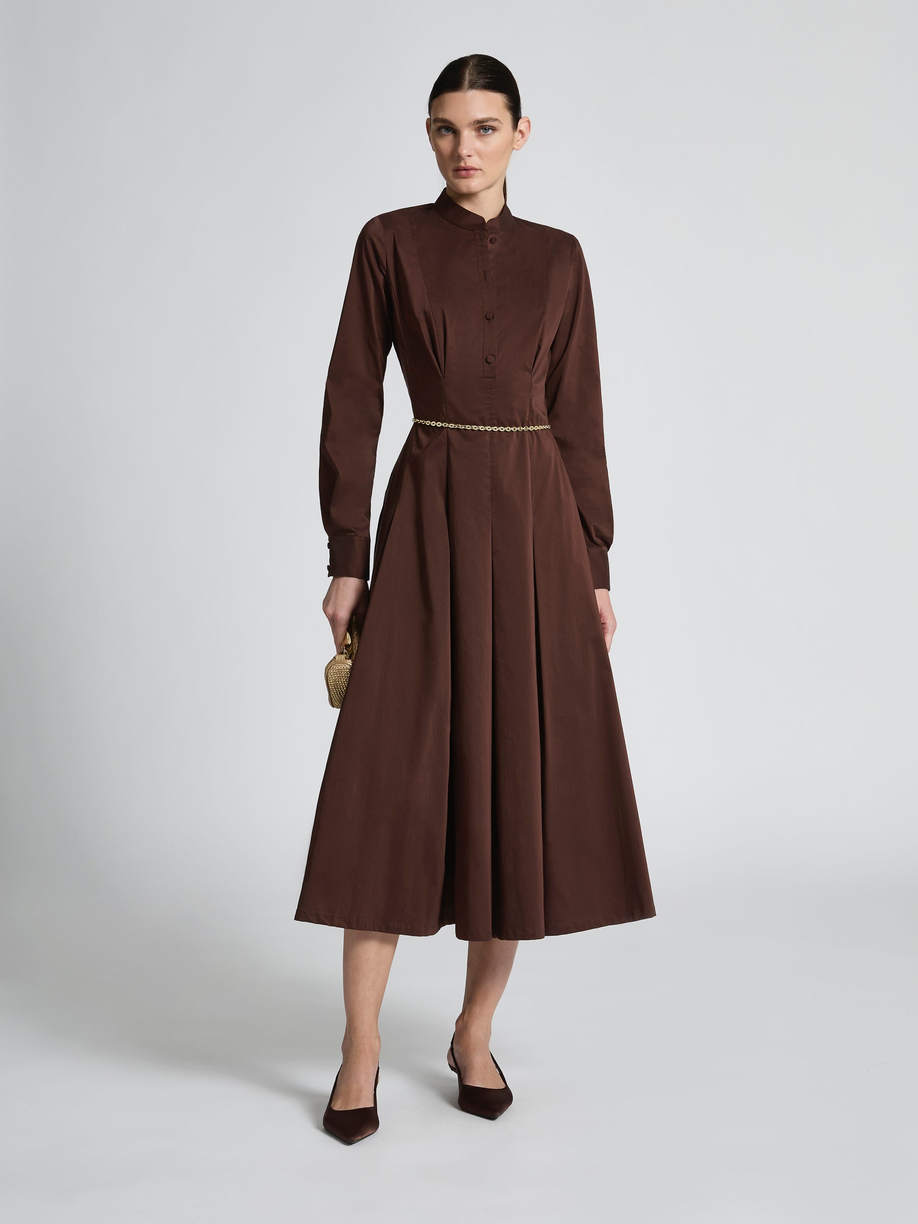 A modern shirt dress crafted from premium stretch cotton, the Lara Shirt Dress designed for polished everyday and workwear dressing. Featuring a structured stand collar, button-through front and box-pleated skirt, this silhouette is defined by a panelled waist that creates a flattering, fitted shape. Finished with discreet side pockets and a side zip closure.