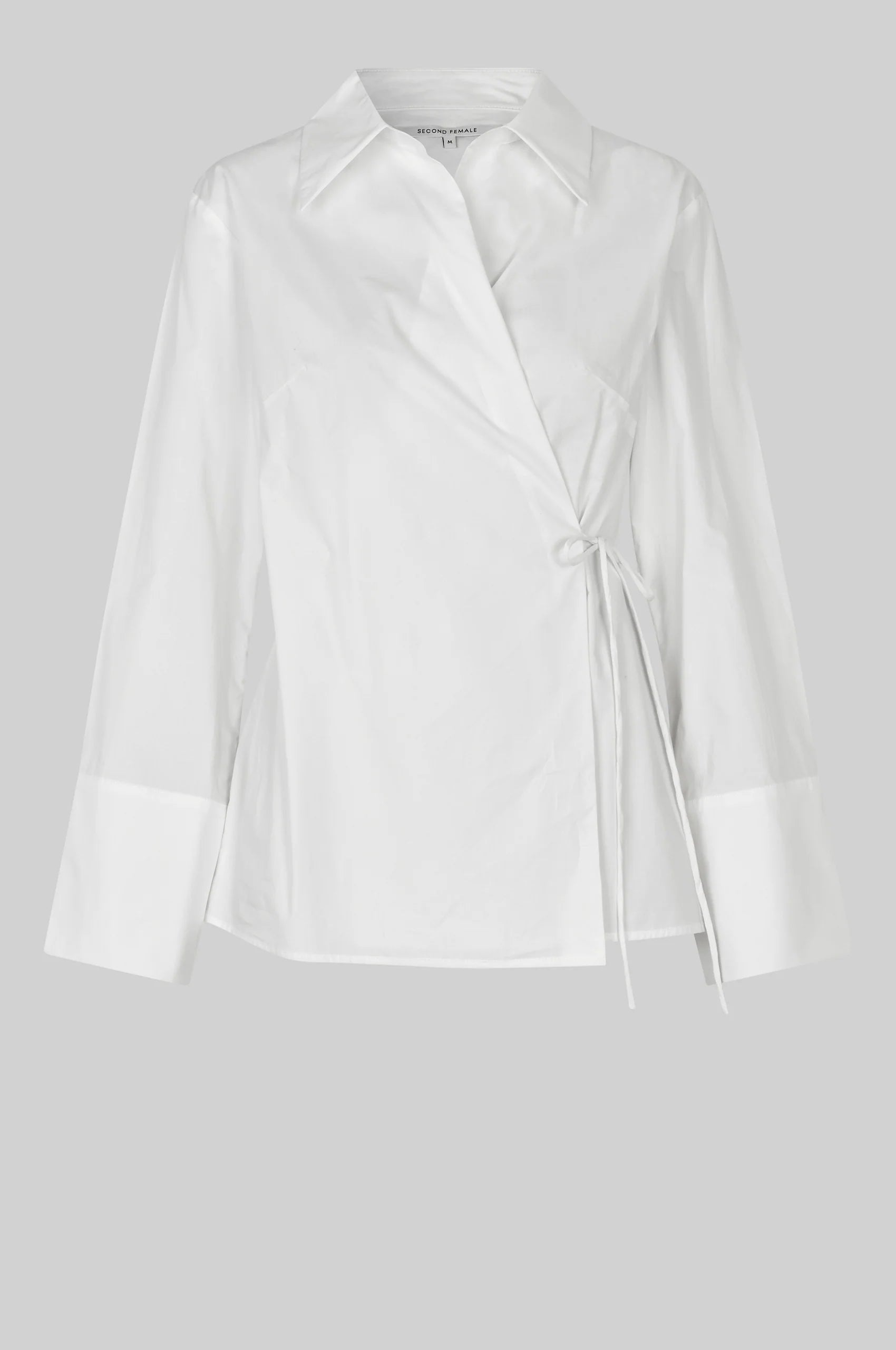 Second Female wrap-around shirt. The shirt is made in light and smooth organic cotton. Featuring a regular collar and cross-over front with ties that fasten at one side. Long sleeves with wide buttoned cuffs. Regular fit.