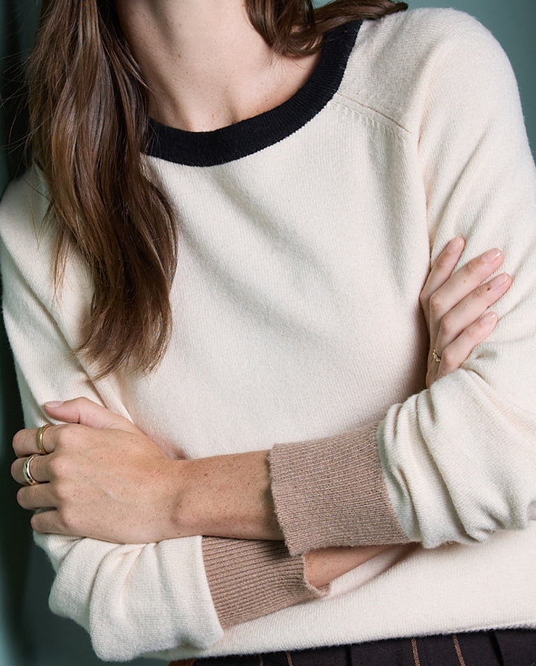 Knitted sweater with round neck and bicolor details on collar, cuffs and hem. Straight cut and long sleeves, it is a versatile and lightweight garment, ideal for everyday wear with a distinctive touch.