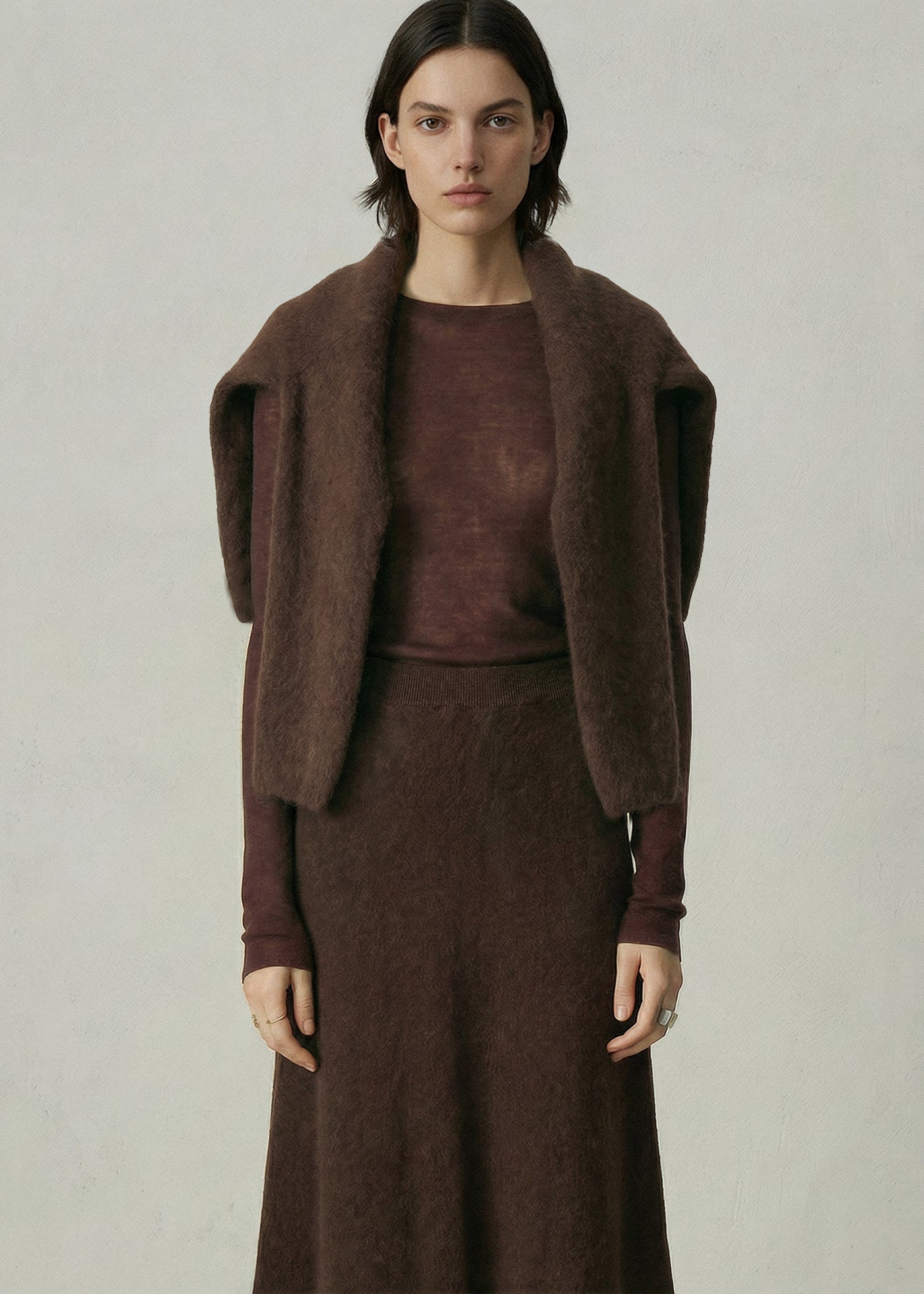 A flowing long Mink skirt in brushed wool-cashmere, designed with a relaxed silhouette that drapes gracefully. Soft to the touch, it moves effortlessly for quiet, understated elegance.